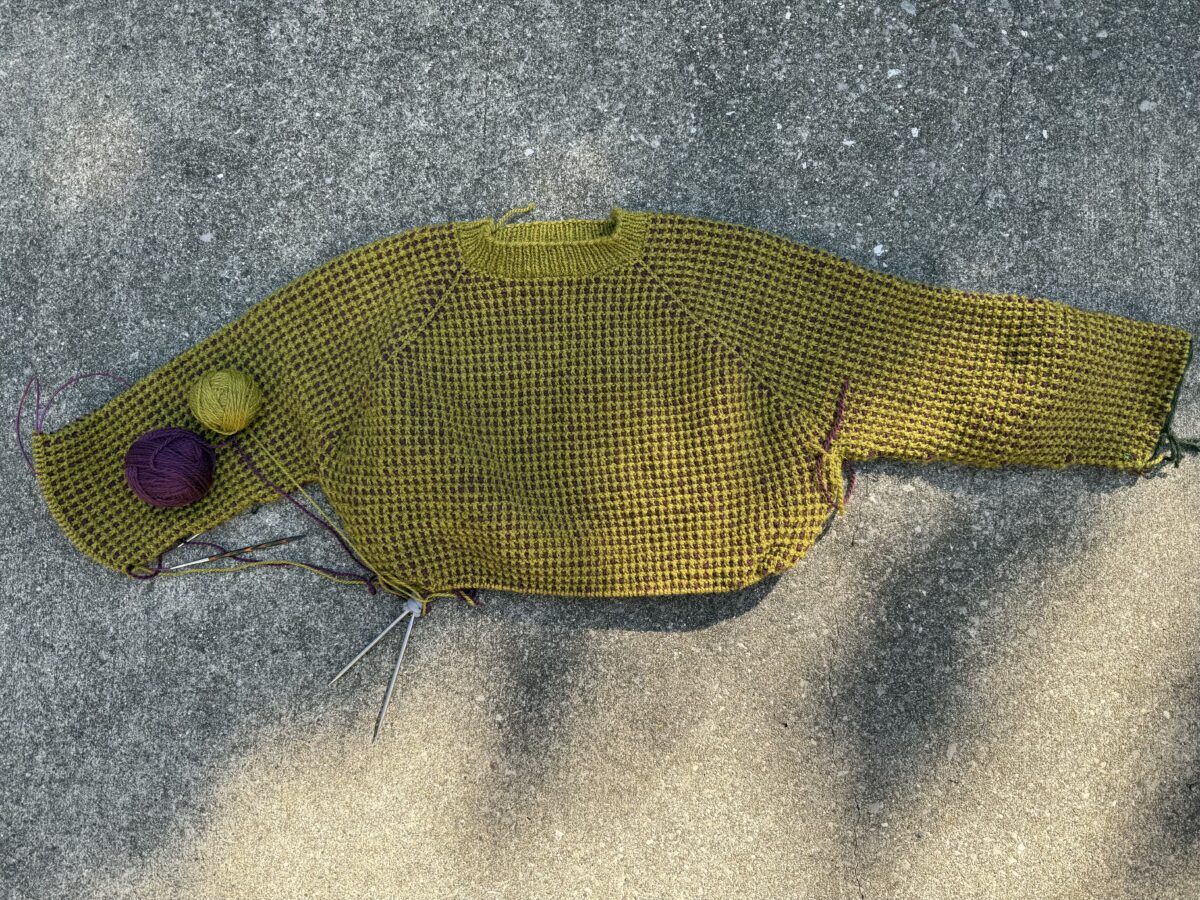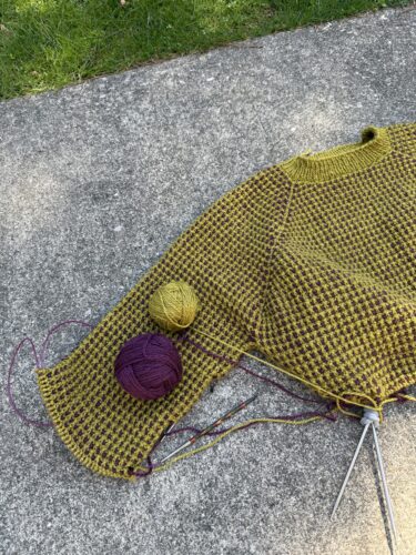 Oh, it has. It started out with BIG dopamine energy. The choosing of the colors. The ordering of the yarn. The comaraderie of knitting with friends. That short row victory! And the squishy goodness of the mosaic pattern. The imagining of actually wearing the finished sweater.