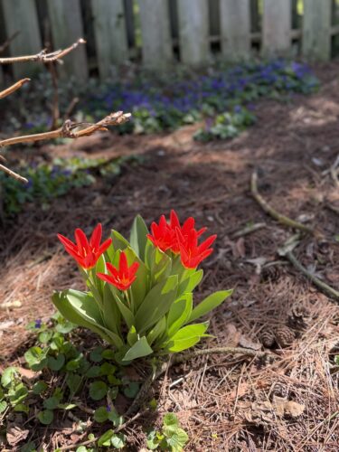 The next March – very near my birthday, I was looking out my kitchen window at my still-hibernating garden and I noticed . . . a random little red flower. All by itself. In the middle of . . . not really much else. I went out to investigate . . . and discovered a lonely little red tulip. That I never planted. It looked strangely like some little red tulips my mom had had in her garden — an early blooming variety.