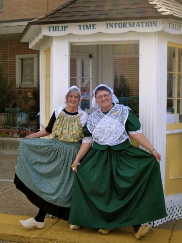 (She loved volunteering at the Tulip Time information booth each year. Here’s a picture of her – she’s on the left – with a pal in their full Tulip Time regalia.) (I sewed her costume, by the way.)