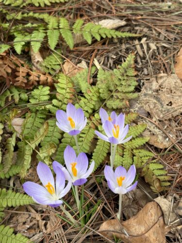 Years ago, I planted a variety of crocus bulbs in my garden. But . . . the squirrels dug up every dang one every time I planted them! After several years, I gave up on the notion of having any crocus in my garden at all. Those squirrels, though? They scattered and planted those bulbs all around the garden (apparently), because now I’ve got them coming up . . . in places I’d never expect to see them. It’s a wonder and a joy – and a pleasant surprise.