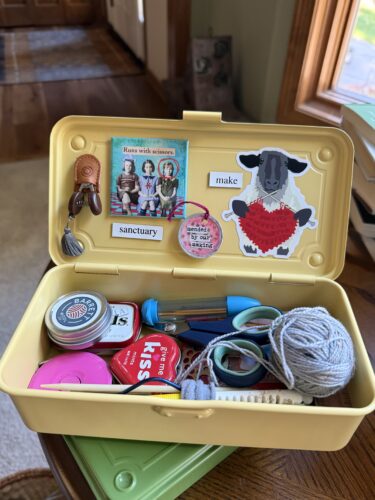 I love it so much . . . that I decided I needed a second one. For my knitting supplies, y’know? So I ordered a yellow one from Modern Daily Knitting’s Christmas pop-up shop a couple of weeks ago. What a nice step up from years of using an old zipper pouch for my knitting tools. It’s handier to tote around, fits easily in my knitting bag, and it’s really easy to see all my knitting bits and bobs and tools now that everything is all nicely laid out in a box (vs. crammed into a pouch).
