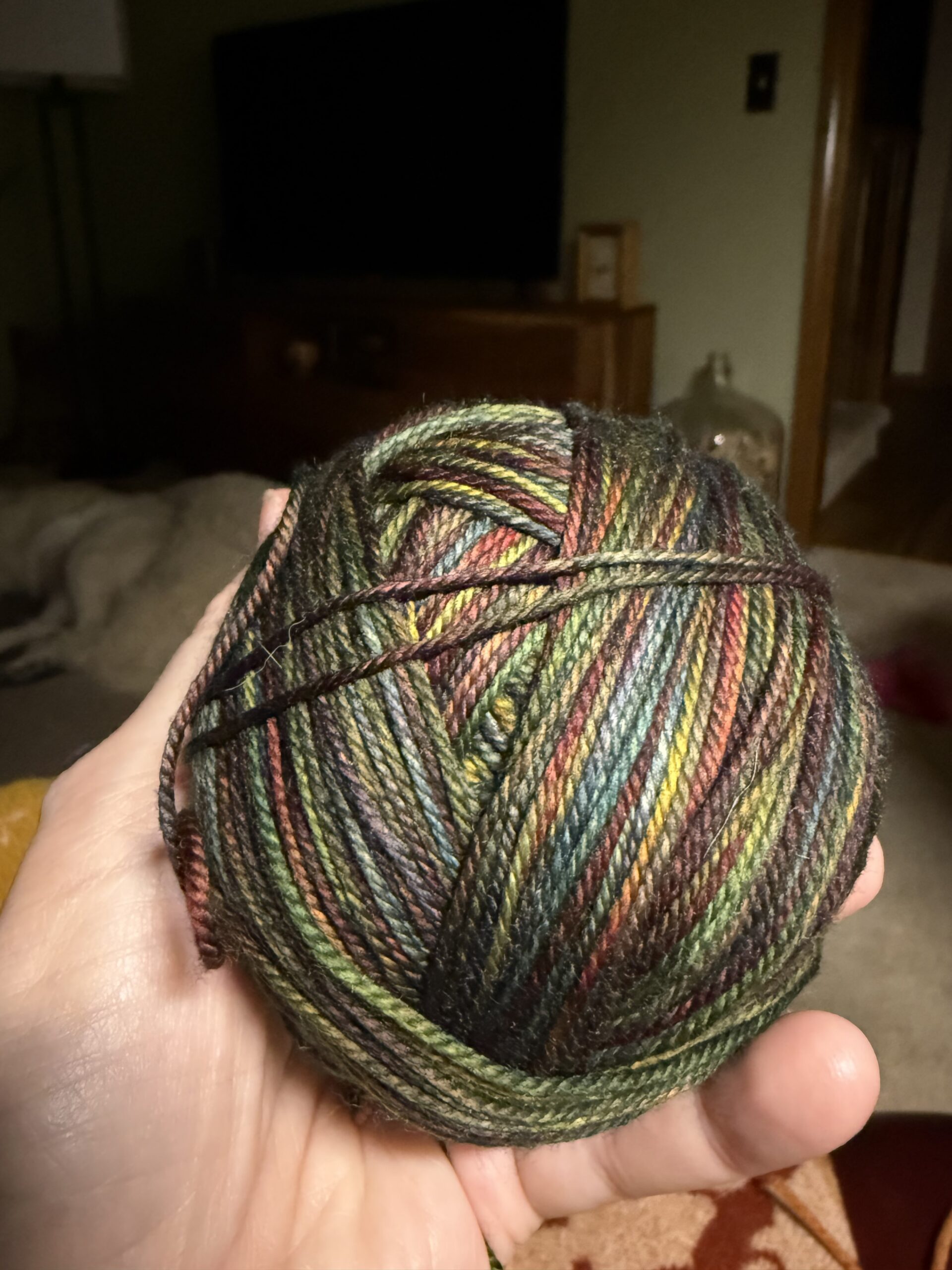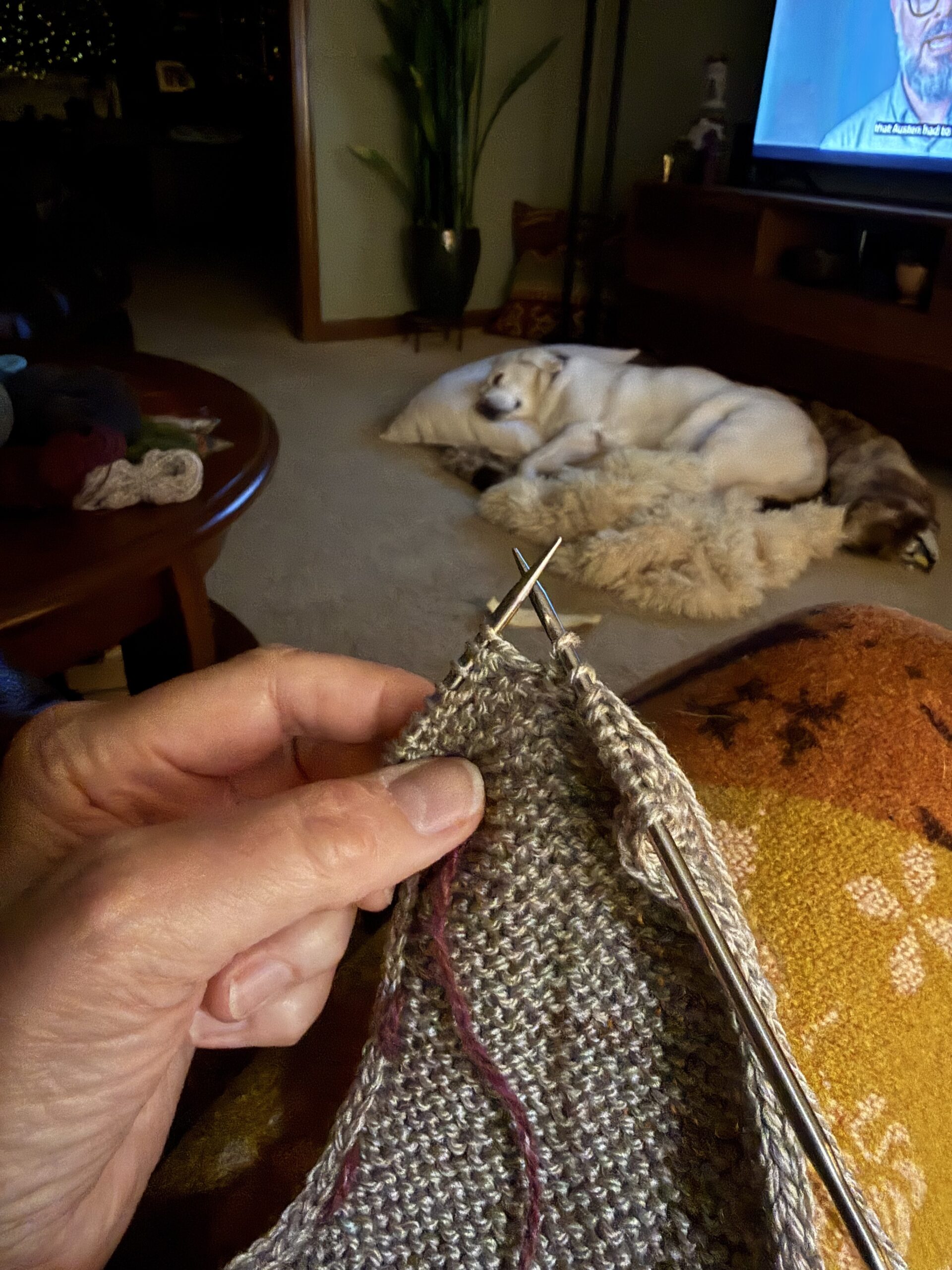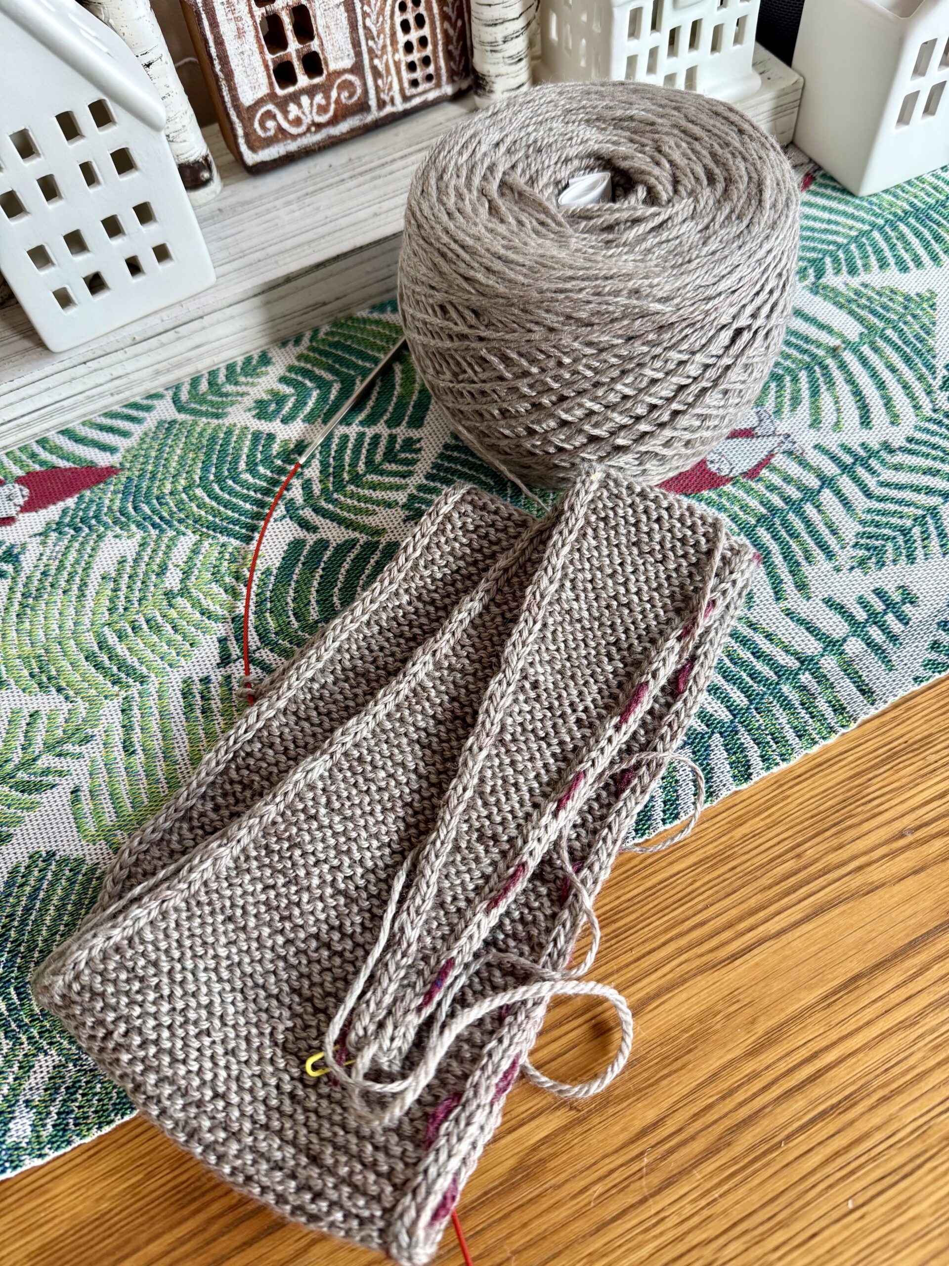 - Sophie Scarf #1 – Trellis by Yarn Hollow, a DK weight yarn with 60% merino/40% bamboo in the colorway Mushroom. (I have had 2 generous skeins – 620 yards each – in my stash since the early 2010s. That’s sweater quantity . . . but I’ve never used it because it has a “sheen” from the bamboo that I didn’t think I liked. I decided to use it for a Sophie Scarf, and lo and behold. . . the yarn is just lovely, sheen and all. It WILL become some sort of sweater now. Just sayin.) Note: Trellis yarn has been discontinued and Yarn Hollow is no longer in business.