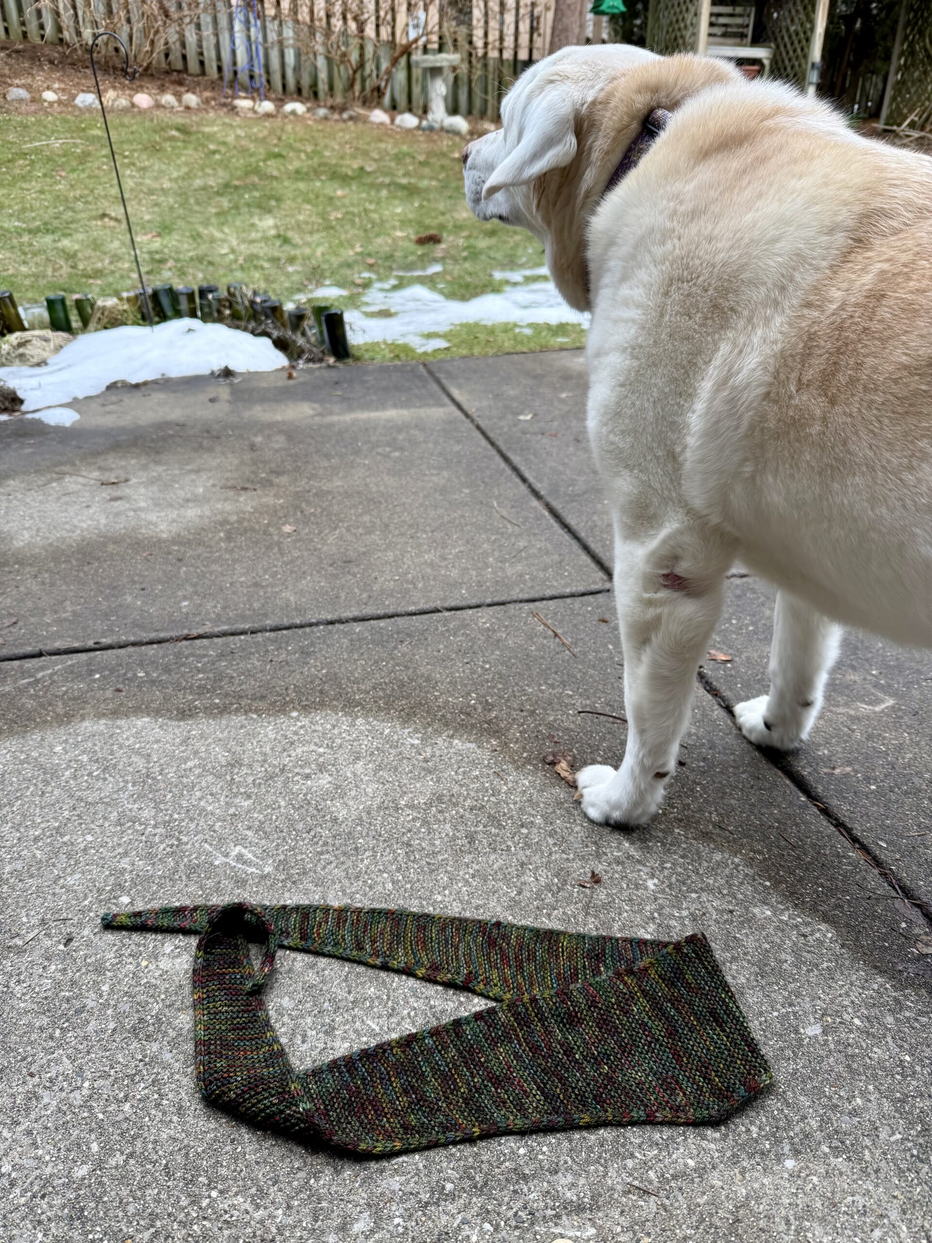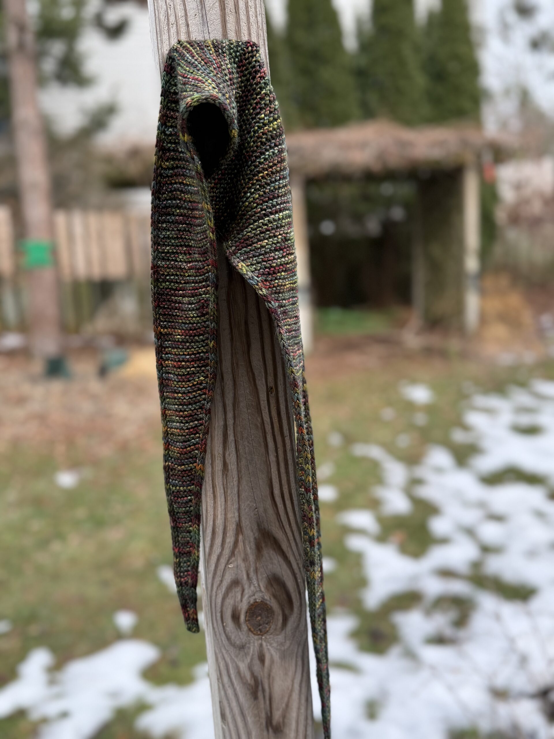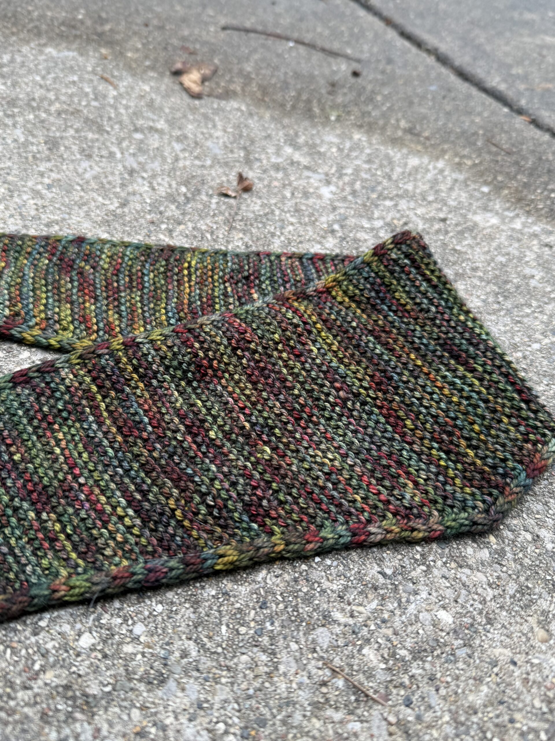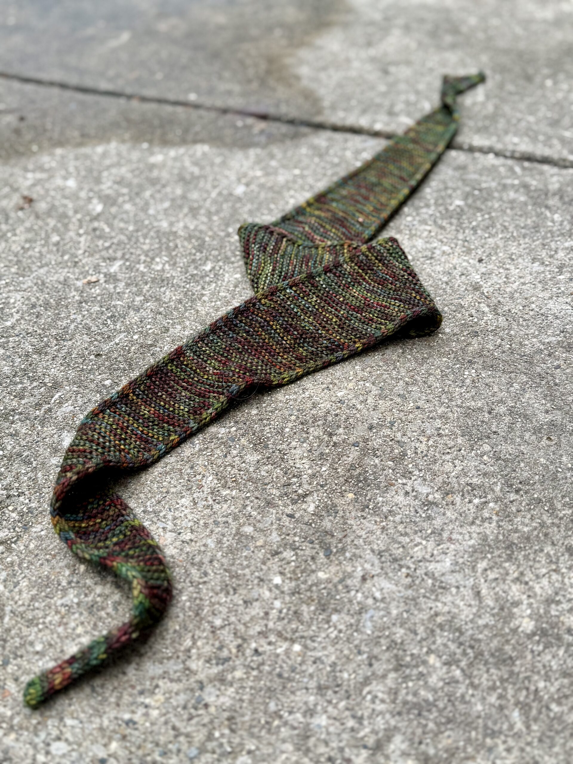 - Sophie Scarf #3 – Pashm from Ewetopia, a DK weight yarn with a blend of 80% merino wool, 10% cashmere, and 10% nylon in the colorway Tapestry. This is a skein I picked up at my one-and-only visit to Rhinebeck back in 2014. This lovely variegated yarn was a Sophie Scarf experiment for me, and it turned out beautifully . . . because of the short color runs.