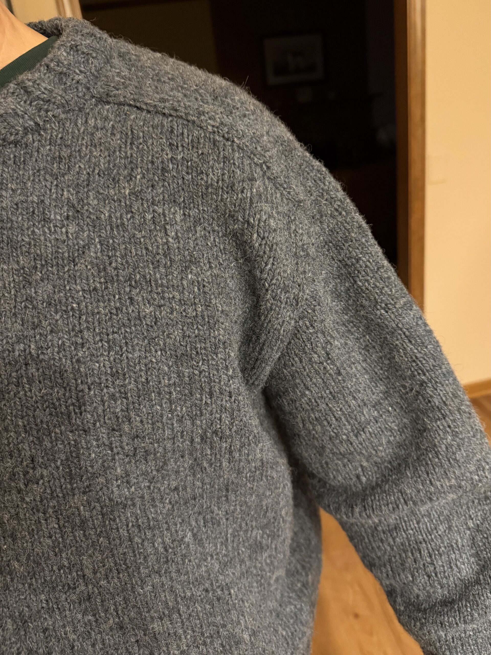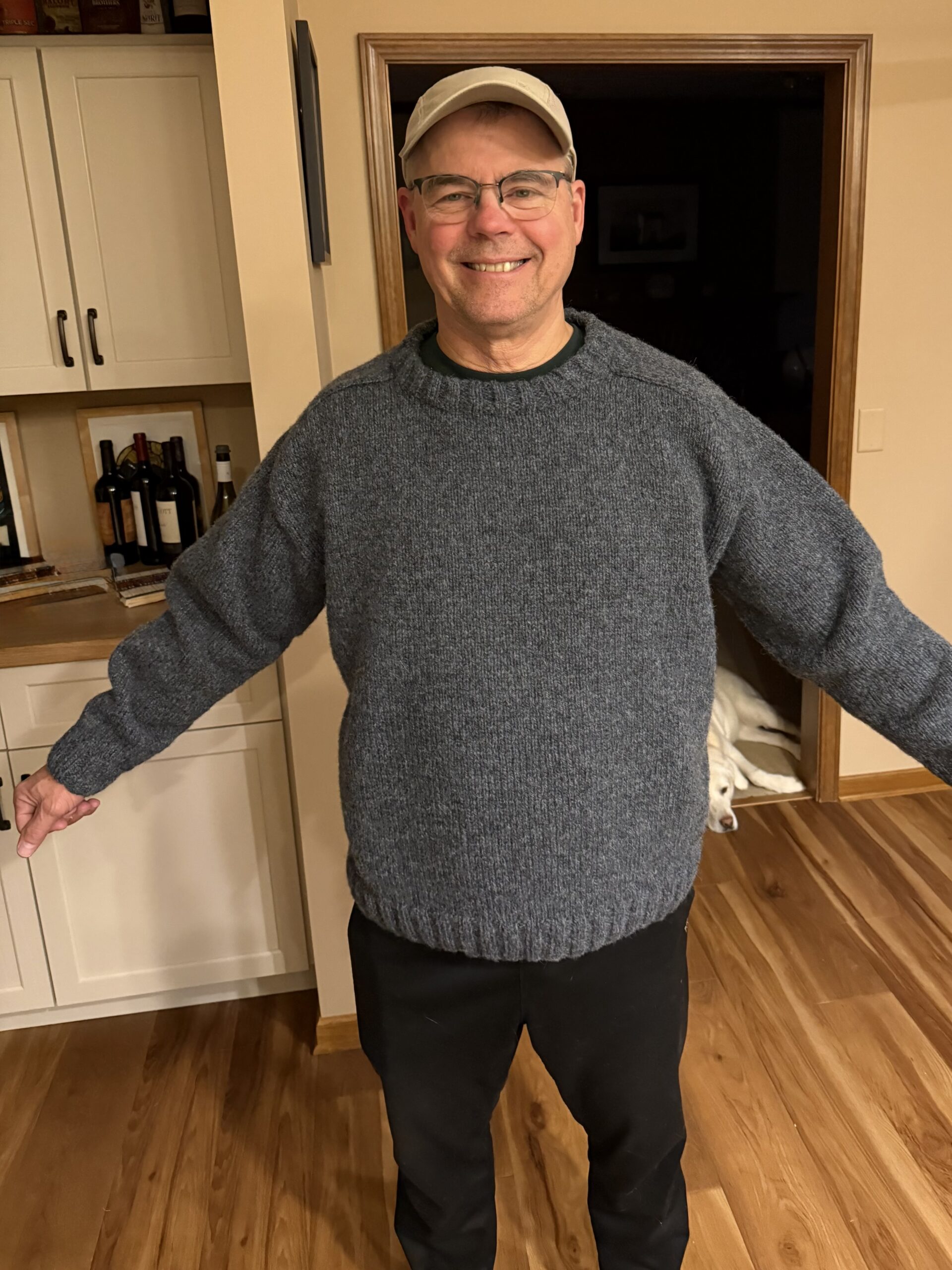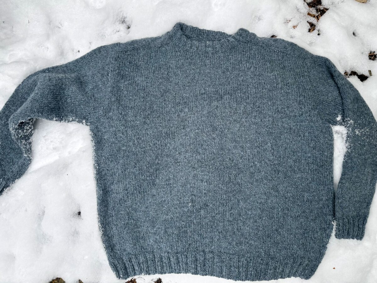 I did, though, intentionally shrink the sweater after the fact . . . by washing it in VERY hot water on low in my washing machine, and then drying it on warm in my dryer. It did shrink enough to be wearable (and did not felt) (bonus). Tom loves the sweater, which he says is very comfortable and cozy. It will be perfect for fishing or just wearing around the house.