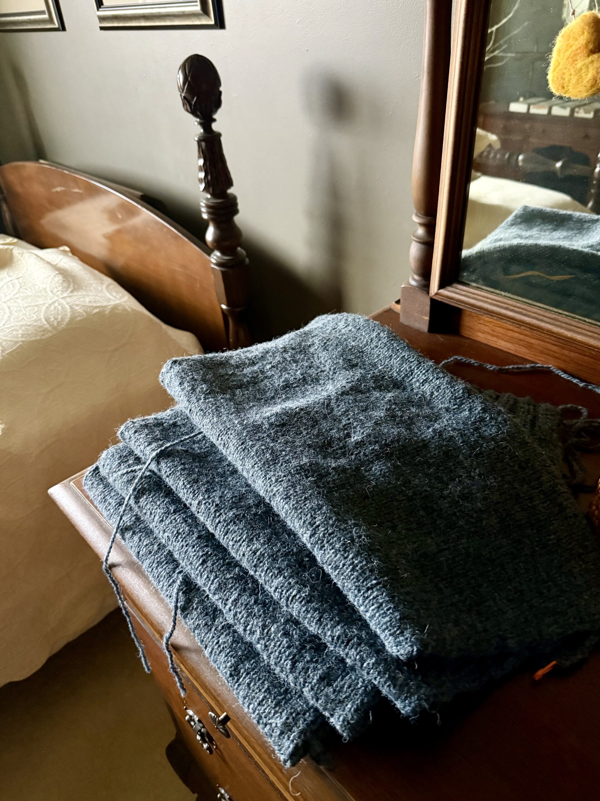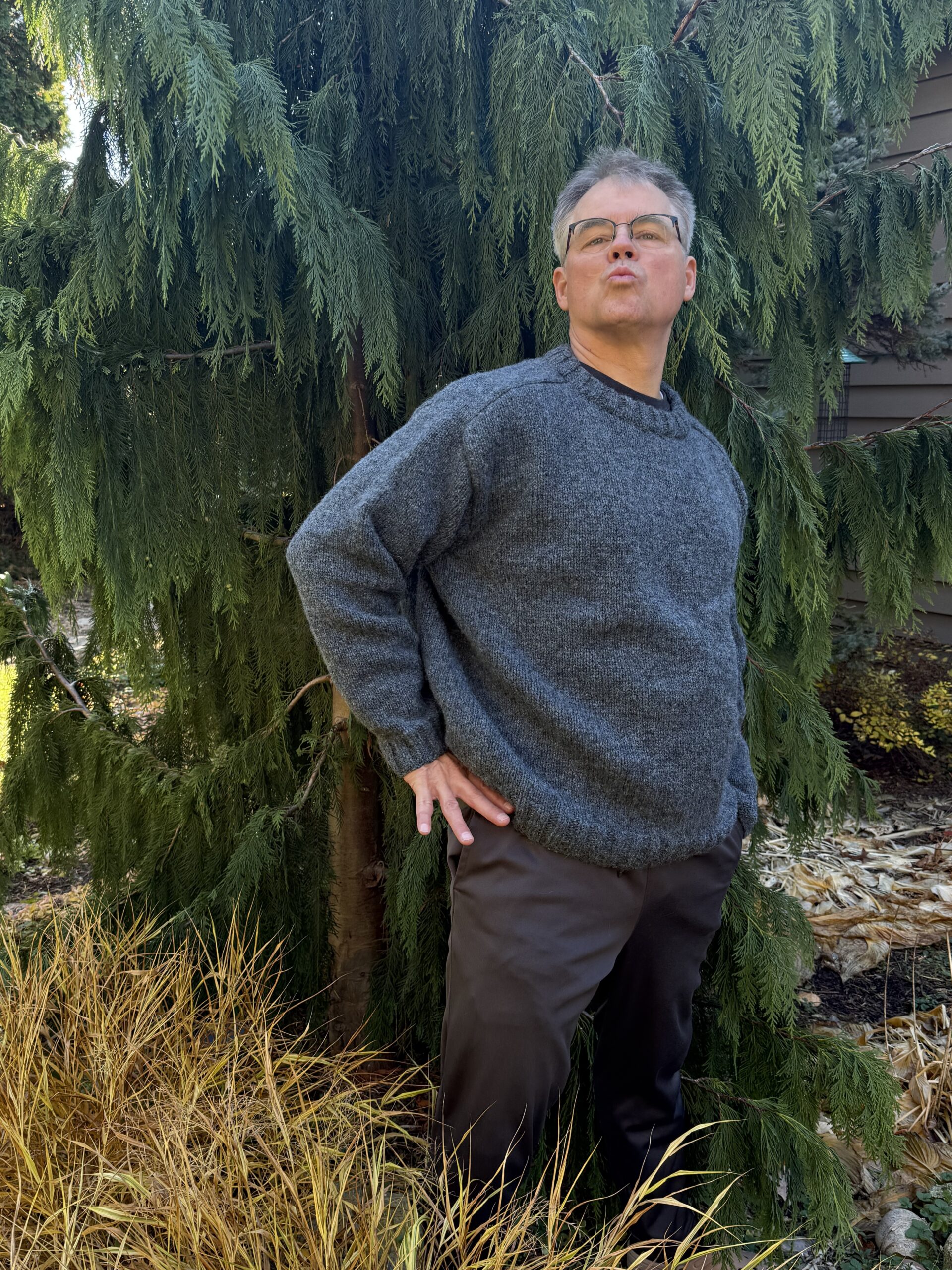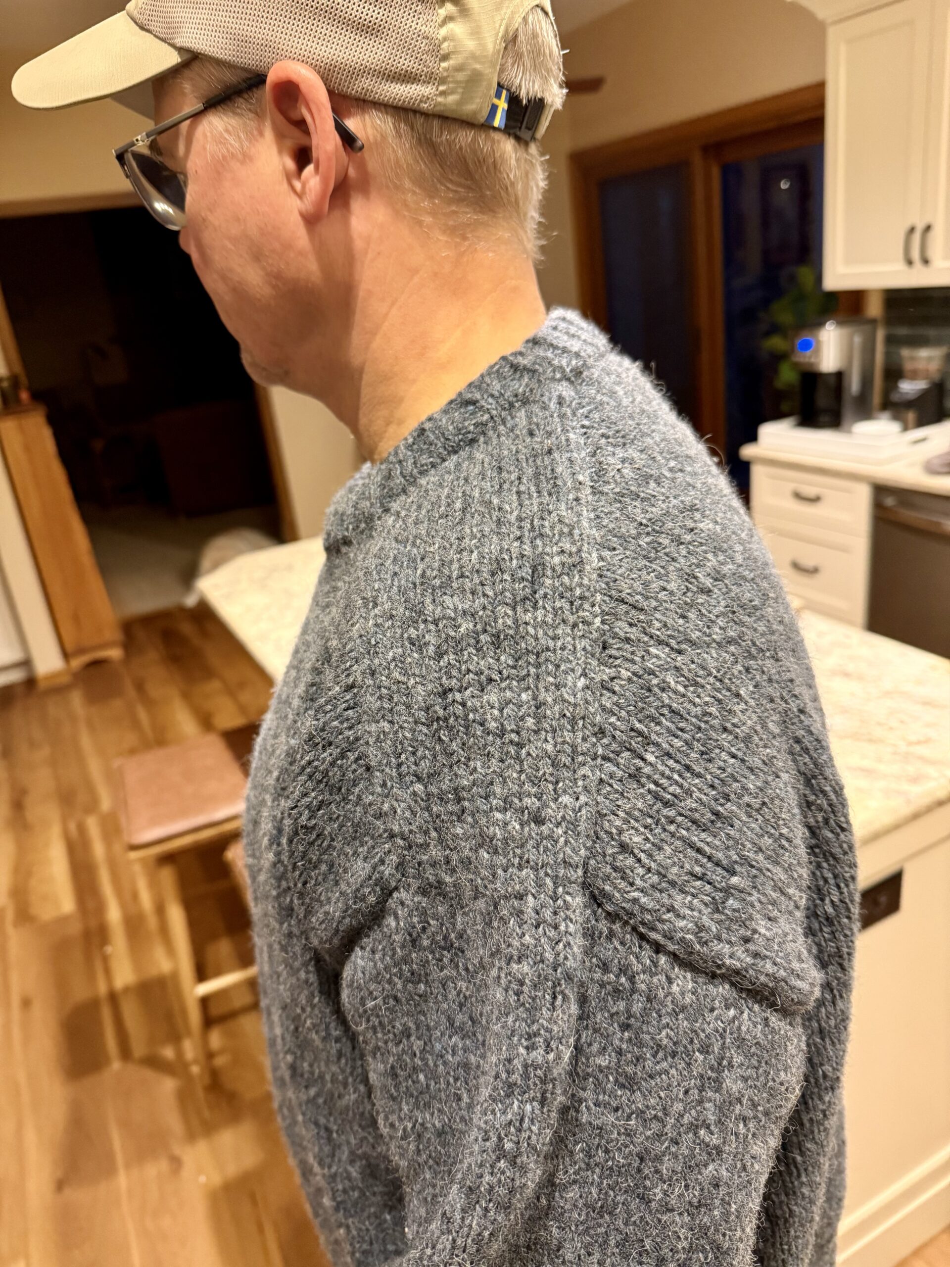 I did, though, intentionally shrink the sweater after the fact . . . by washing it in VERY hot water on low in my washing machine, and then drying it on warm in my dryer. It did shrink enough to be wearable (and did not felt) (bonus). Tom loves the sweater, which he says is very comfortable and cozy. It will be perfect for fishing or just wearing around the house.