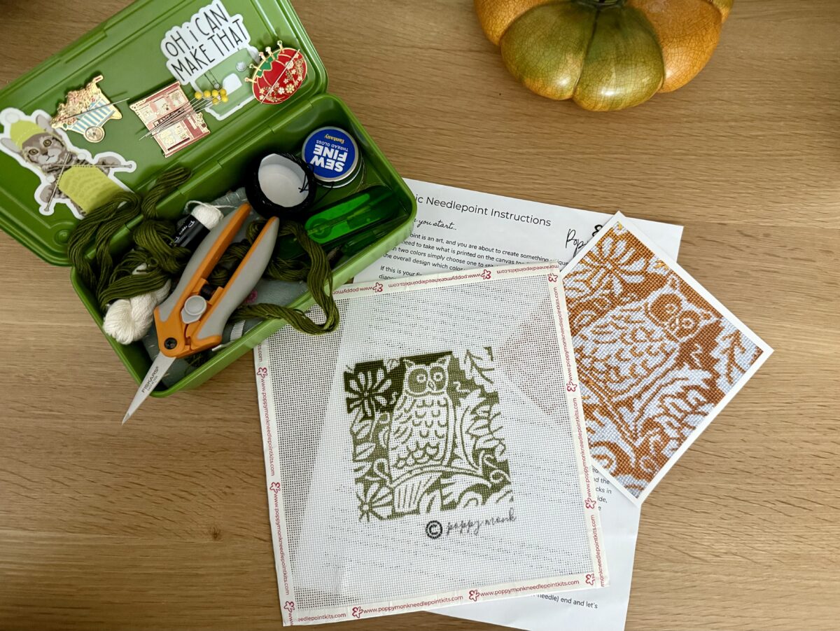 And this year, I finally decided to scratch that old itch and teach myself basic needlepoint. I bought a little kit from Poppy Monk, watched a few YouTube videos, and . . . just started in. Now here’s where I’ll admit that . . . I started with NOT a beginner kit. Poppy Monk has some really lovely beginner kits — big swaths of needlepoint areas where you can really get into the rhythm of the stitching. I mistakenly thought this owl kit WAS a beginner kit . . . because it is small. (And it is small – 4 inches X 4 inches.) But you can see that there are not “big swaths of areas where you can really get into the rhythm of the stitching.” And that would’ve been a smarter way for me to begin. But . . . I didn’t. I’m getting the hang of it, though.