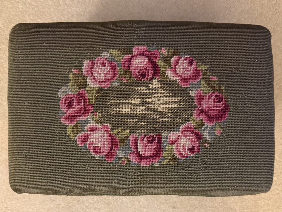 It started here, you see . . . with this needlepoint stepstool I used to sit on in my great grandma’s bedroom . . . where my sweet little grandma let me play with the buttons in her button box and taught me to embroider. She was patient, and she was eager to pass on her love of handiwork and needlecraft to me. (I secretly think she was also hiding out from my grandmother – her daughter – who was not patient and had no interest in handiwork.)