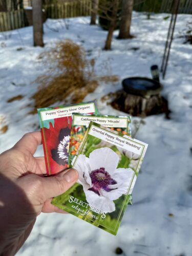 Poppies are challenging to grow from seed because the conditions have to be Just Right. They’re a bit fussy, mostly because they need cold stratification to germinate. One way, though, to plant poppy seeds . . . is to sow the seeds right on top of the snow. Because instant cold stratification! As the snow melts (and then as more snow falls), the poppy seeds get that cold start they need . . . and by spring, the melting snow helps the seeds germinate in the garden soil, and . . . voilà! Poppies bloom in your garden. Like magic!