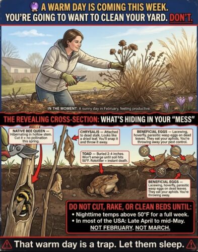 This little graphic illustration from the Regenerative Farmers of America highlights just why we shouldn’t be TOO eager to get our gardens cleaned up in the spring. Just because it’s a nice, warm day . . . and we’re eager to get-out-there-and-garden again . . . it’s actually time to use some restraint and hold ourselves back.