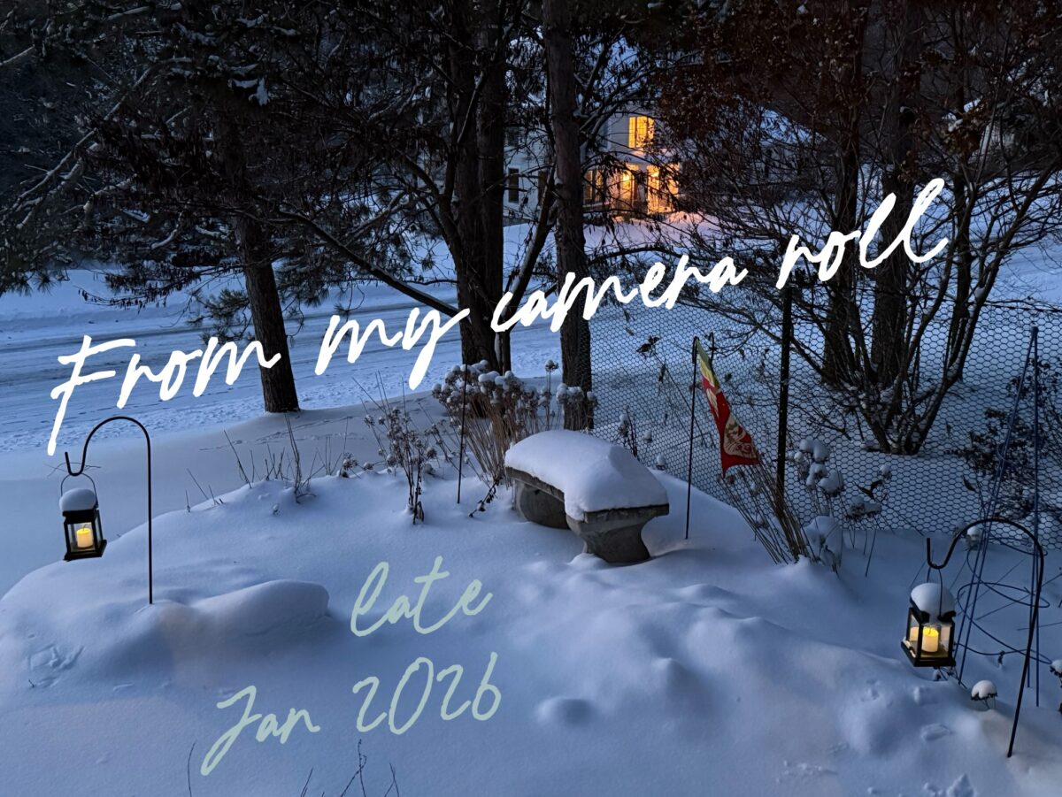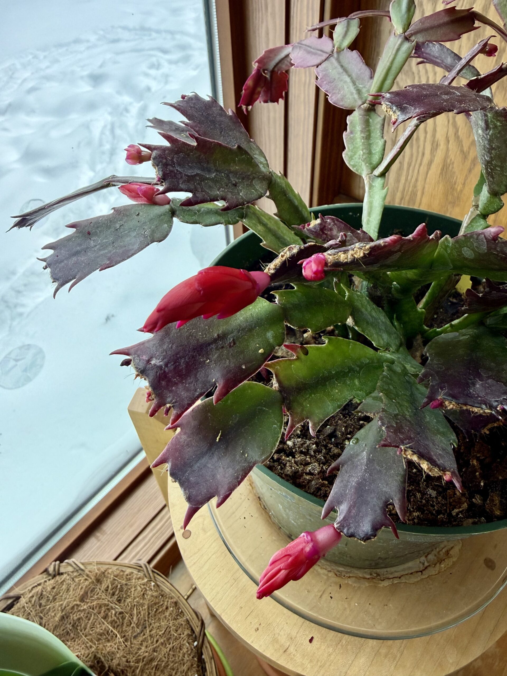 Your view is almost identical to mine. Snow, a Christmas cactus in bloom, plants that are trying to remember spring, a dog snuggling under the exact same blanket, a stew, and that poignant and reflective look when I see myself in the mirror. I just had a BD yesterday, and I am now 3/4 of a century old. Seems impossible, and I am overwhelmed with things to reflect on. Thanks for the camera roll, Kym.