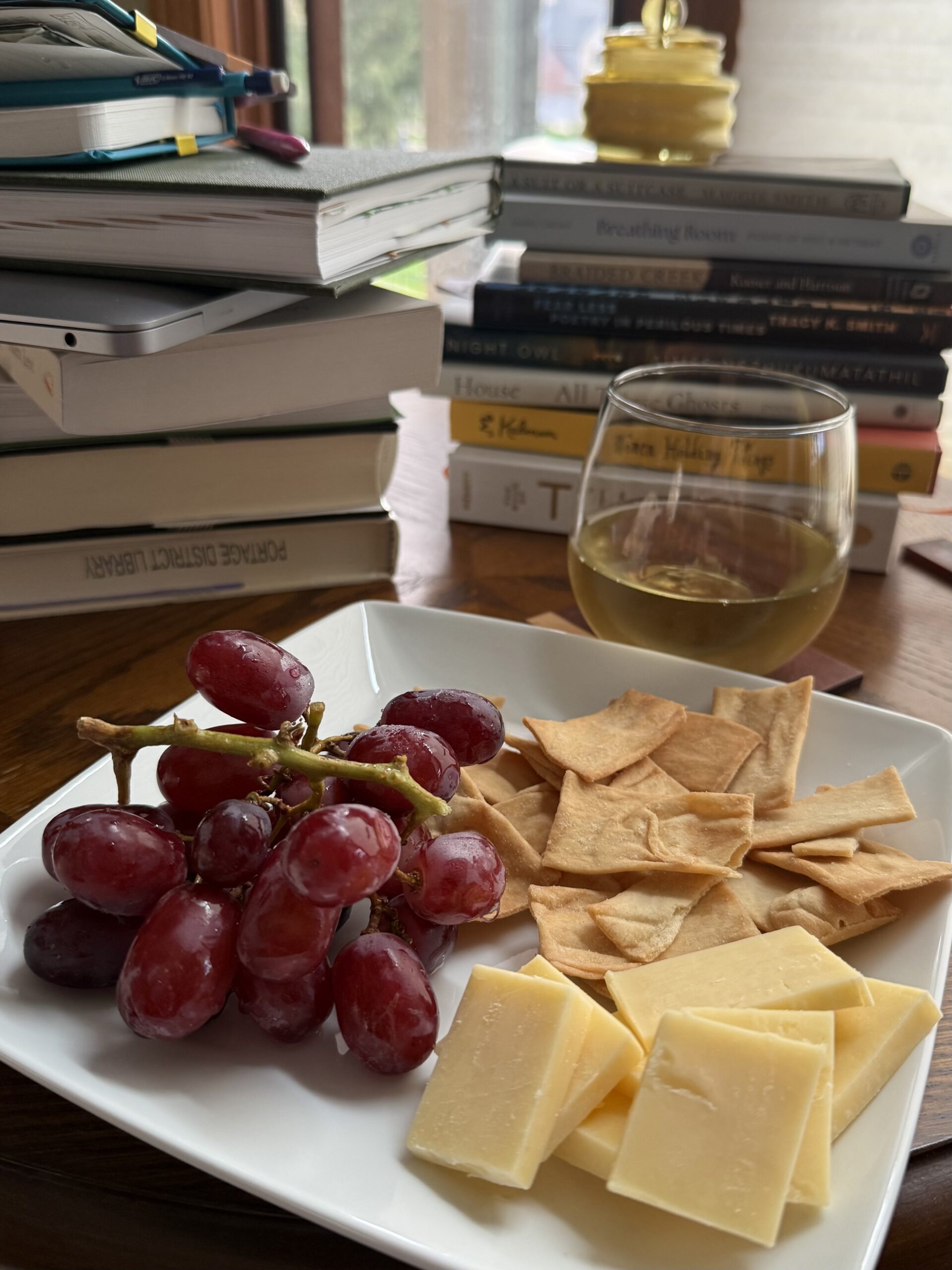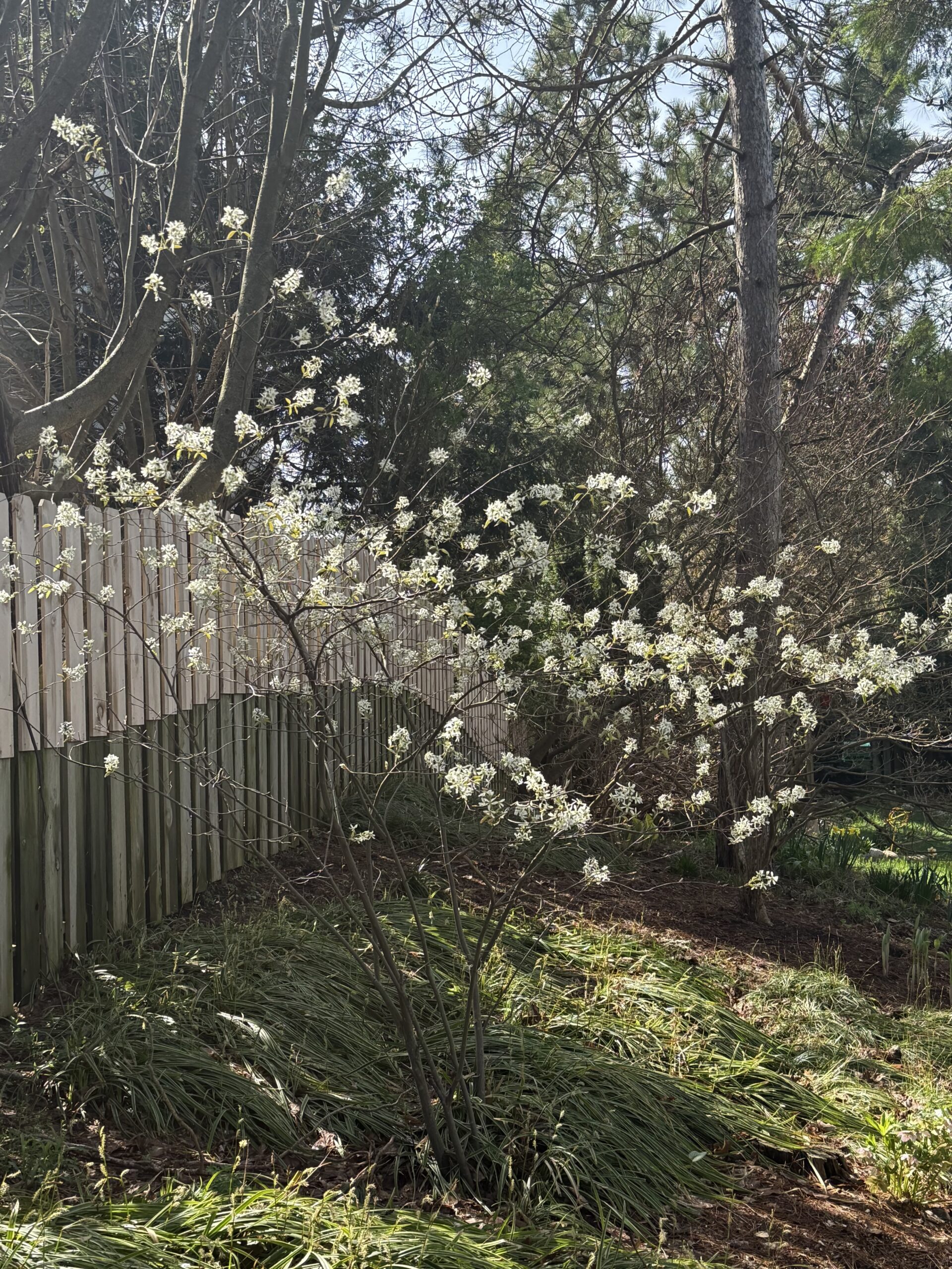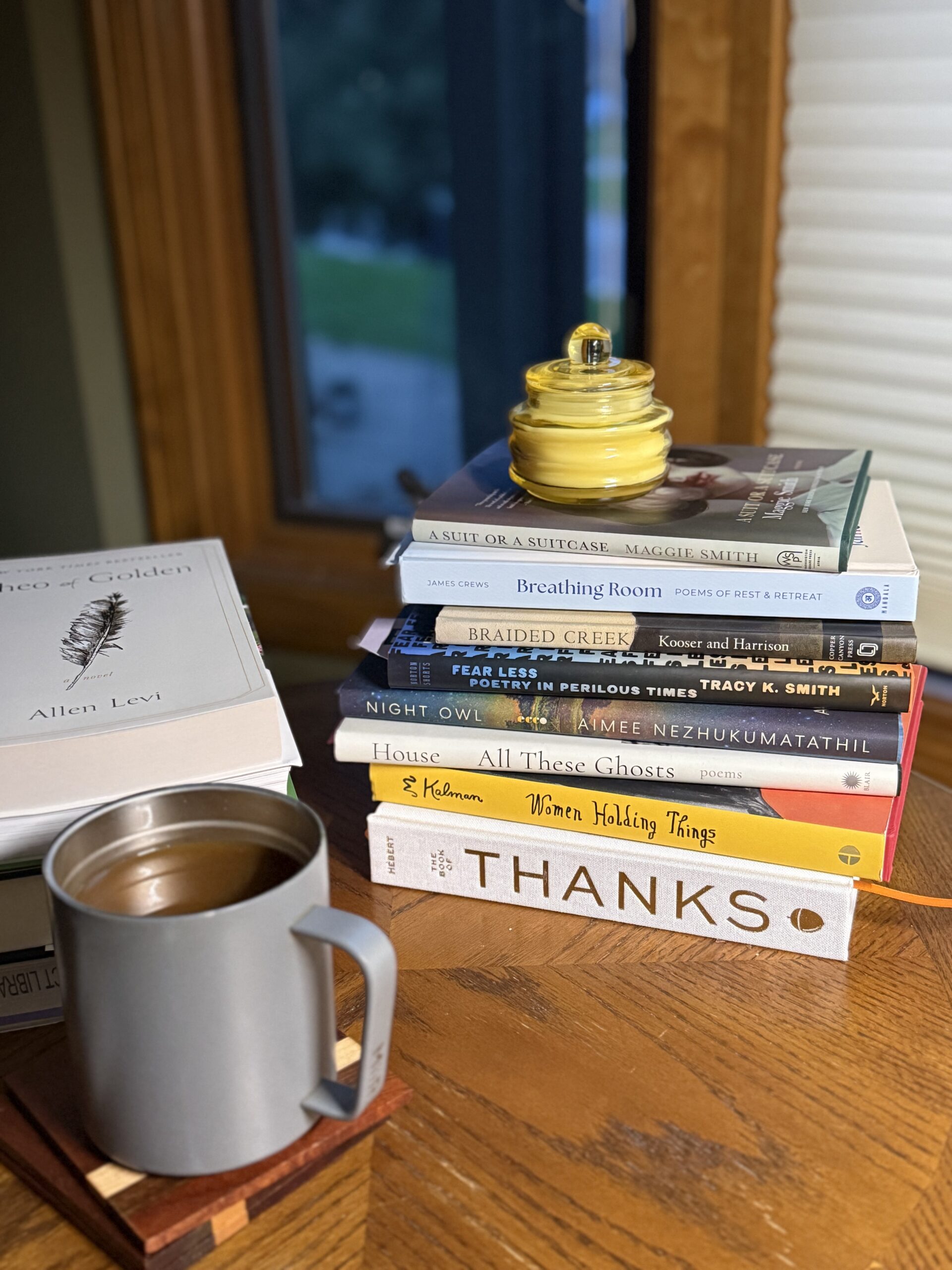 I love seeing your poetry books piled up and ready to read, and I also see some volumes I may need to purchase for myself as a Poetry Month present. Your dinner looks delightful and that serviceberry is indeed magical!
