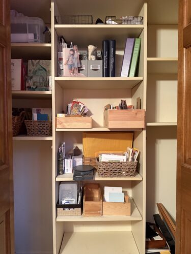 This is the (still in progress) closet reorganization in my office. I’m still in the “messy middle” phase of my office-reorganization, but I can see that it’s coming together now. I have a functional closet. My file cabinet is nearly empty. I have a bookshelf with plenty of space.